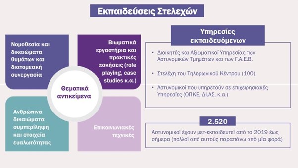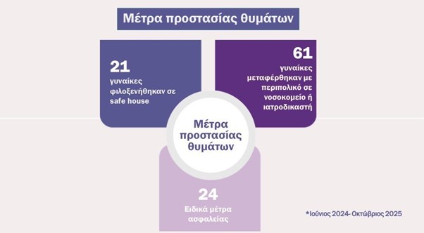 Στο πεδίο της προστασίας των θυμάτων, παρουσιάστηκαν τα μέτρα που εφαρμόστηκαν από τον Ιούνιο του 2024 έως τον Οκτώβριο του 2025. Σύμφωνα με τα στοιχεία, 21 γυναίκες φιλοξενήθηκαν σε προστατευμένους ξενώνες, 61 μεταφέρθηκαν με αστυνομικό όχημα σε νοσοκομεία ή ιατροδικαστικές υπηρεσίες και σε 24 περιπτώσεις εφαρμόστηκαν ειδικά μέτρα ασφαλείας. Τα στοιχεία αυτά δείχνουν την προσπάθεια για ουσιαστική υποστήριξη των θυμάτων που βρίσκονται σε άμεσο κίνδυνο.