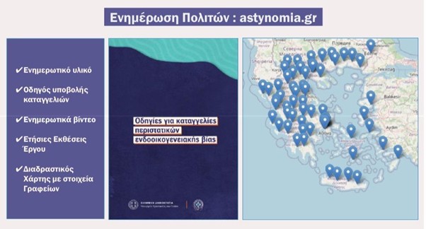 Σημαντικό μέρος του έργου αποτελεί και η ενημέρωση των πολιτών. Οι υπηρεσίες υλοποίησαν διαλέξεις ενηλίκων, πραγματοποίησαν διανομή ενημερωτικού υλικού, συμμετείχαν σε ημερίδες και συνέδρια και διοργάνωσαν δράσεις σε σχολεία και κοινωνικές δομές. Η ενημέρωση υποστηρίζεται και ψηφιακά, μέσω της ιστοσελίδας της Ελληνικής Αστυνομίας, όπου παρέχονται οδηγοί υποβολής καταγγελιών, ενημερωτικά βίντεο, ετήσιες εκθέσεις έργου και ένας διαδραστικός χάρτης με τα Γραφεία Αντιμετώπισης Ενδοοικογενειακής Βίας. Επιπλέον, μέσω του προγράμματος SAFE.YOUth, δημιουργήθηκε ειδικό ενημερωτικό υλικό για τρεις ηλικιακές κατηγορίες νέων, ενώ παράλληλα λειτουργεί η γραμμή 10201 για υποθέσεις που αφορούν ανηλίκους, με δυνατότητα υποβολής ανώνυμων ή επώνυμων καταγγελιών μέσω gov.gr.
