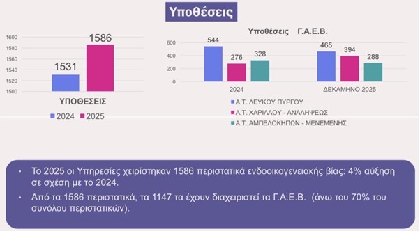 Η Αστυνόμος Β΄ Καλλιόπη Γκούρμη παρουσίασε έναν πλήρη απολογισμό του έργου των Υπηρεσιών Αντιμετώπισης Ενδοοικογενειακής Βίας της Γενικής Αστυνομικής Διεύθυνσης Θεσσαλονίκης, προσφέροντας μια συνολική εικόνα για την έκταση του φαινομένου, τη δομή των υπηρεσιών, την επιχειρησιακή τους ανάπτυξη και την πορεία των περιστατικών που καταγράφηκαν τα τελευταία έτη. Τα στοιχεία που παρουσιάστηκαν δείχνουν μια σταθερή αύξηση τόσο στον αριθμό των υποθέσεων όσο και στους εμπλεκόμενους, μαζί με μια παράλληλη ενίσχυση των δομών και των μέτρων προστασίας που εφαρμόζονται.