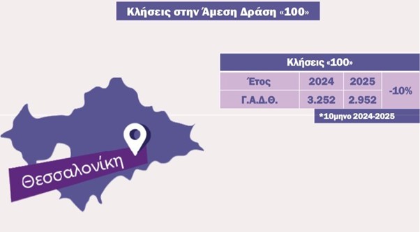 Η ανάλυση των κλήσεων που δέχθηκε η Άμεση Δράση «100» στη Θεσσαλονίκη αποτυπώνει μια σημαντική μείωση σε σχέση με το προηγούμενο έτος. Συγκεκριμένα, στο δεκάμηνο 2024 καταγράφηκαν 3.252 κλήσεις που αφορούσαν περιστατικά ενδοοικογενειακής βίας, ενώ στο αντίστοιχο δεκάμηνο του 2025 οι κλήσεις μειώθηκαν σε 2.952, σημειώνοντας πτώση της τάξης του 10%. Η μείωση των κλήσεων δεν αντιστοιχεί απαραίτητα σε μείωση των πραγματικών περιστατικών, καθώς την ίδια περίοδο οι καταγεγραμμένες υποθέσεις και οι συλλήψεις αυξήθηκαν, γεγονός που υποδηλώνει ότι ολοένα και περισσότερα περιστατικά οδηγούνται απευθείας στις υπηρεσίες χωρίς μεσολάβηση της Άμεσης Δράσης ή ότι τα Γραφεία Αντιμετώπισης Ενδοοικογενειακής Βίας έχουν καταστεί το πρώτο σημείο επαφής για τους πολίτες.