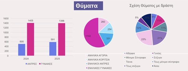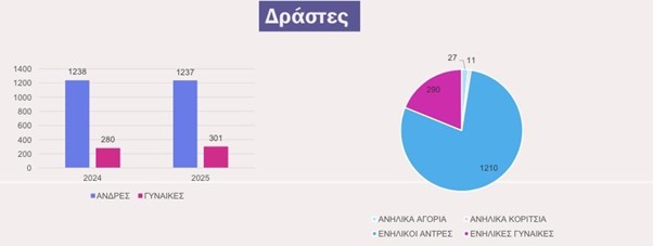 Σε ό,τι αφορά τα θύματα, το 2025 καταγράφηκαν συνολικά 1.987 άτομα, αυξημένα κατά 4% από το προηγούμενο έτος. Οι γυναίκες αποτελούν περίπου το 70% των θυμάτων, ενώ το 26% αφορά ανήλικους. Αξιοσημείωτο είναι το ότι το υψηλότερο ποσοστό θυμάτων στις ανήλικες ηλικίες αφορά τέκνα που υπέστησαν κακοποίηση από τους γονείς τους, με το ποσοστό να φτάνει το 23% των περιπτώσεων. Αντίστοιχη είναι η εικόνα και στους δράστες, οι οποίοι για το 2025 ανήλθαν σε 1.538, παρουσιάζοντας μικρή αύξηση της τάξης του 1%. Το 80% των δραστών είναι άνδρες, ενώ το 2,5% είναι ανήλικοι. Το μεγαλύτερο μέρος των δραστών, σε ποσοστό που υπερβαίνει το 85%, είναι ημεδαποί.
