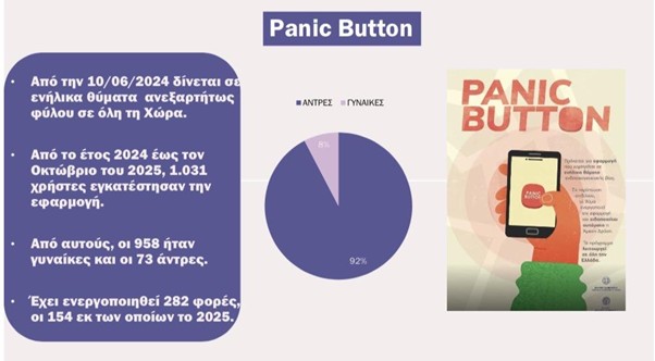 Ιδιαίτερη αναφορά έγινε στην εφαρμογή Panic Button, η οποία τέθηκε σε λειτουργία στις 10 Ιουνίου 2024 ως ένα κρίσιμο εργαλείο άμεσης προστασίας για ενήλικα θύματα. Μέχρι τον Οκτώβριο του 2025 την έχουν εγκαταστήσει 1.031 χρήστες, από τους οποίους 958 είναι γυναίκες και 73 άνδρες, ενώ στο ίδιο διάστημα η λειτουργία του έχει ενεργοποιηθεί 282 φορές. Από αυτές, οι 154 ενεργοποιήσεις σημειώθηκαν μόνο μέσα στο 2025, επιβεβαιώνοντας ότι η εφαρμογή αποτελεί σημαντικό μηχανισμό άμεσης παρέμβασης σε περιπτώσεις κινδύνου.