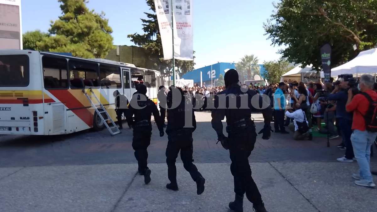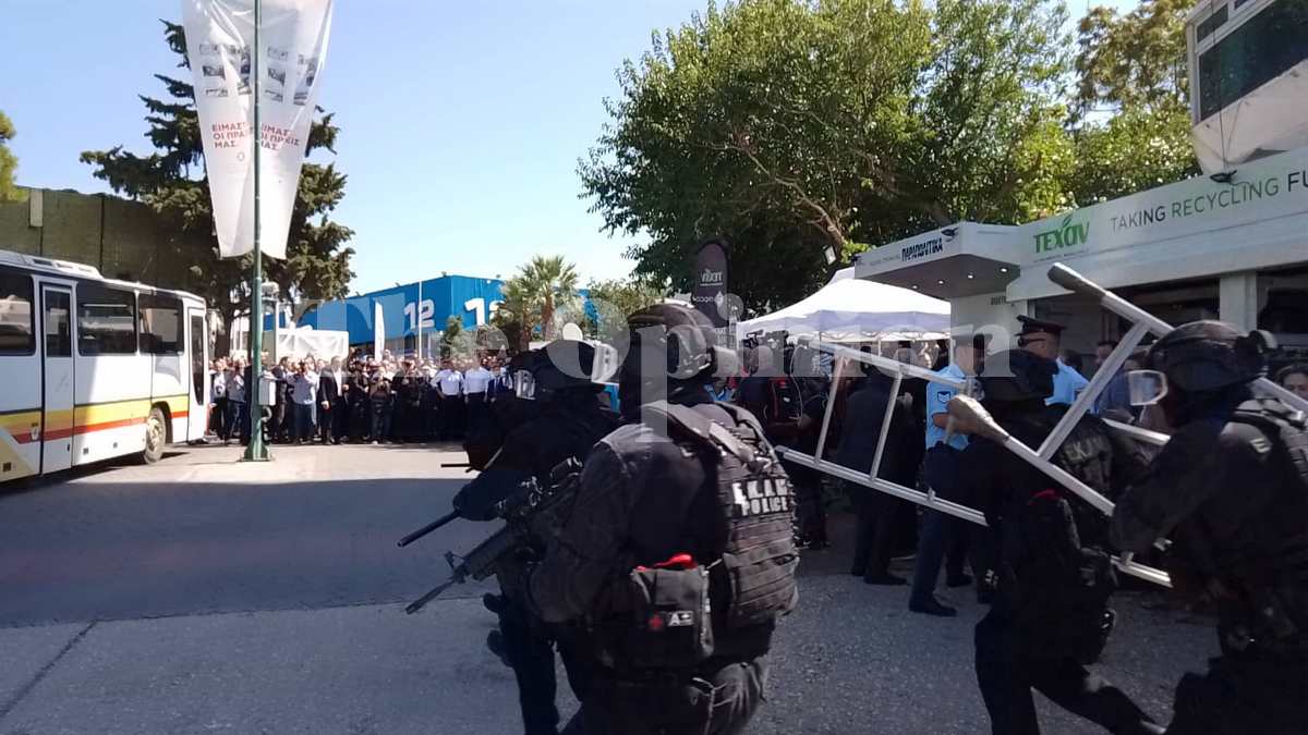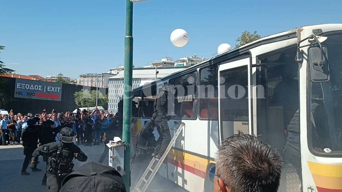 Χειροβομβίδες κρότου λάμψης και φωνές συνθέτουν το σκηνικό. Με τα ειδικά σφυράκια σπάζουν τα τζάμια και τις πόρτες και εισβάλουν μέσα στο λεωφορείο. Η επίδειξη των ΕΚΑΜ έγινε κατά την διάρκεια της επίσκεψης του Κυριάκου Μητσοτάκη στην ΔΕΘ.