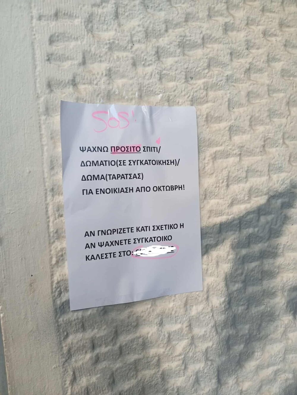 «Ψάχνω προσιτό σπίτι/ δωμάτιο σε συγκατοίκηση. Αν γνωρίζετε κάτι σχετικό ή αν ψάχνετε συγκάτοικο καλέστε στο…», αναγράφεται σε χαρτί που έχει τοιχοκολληθεί κοντά σε εισόδους πολυκατοικιών στο κέντρο της Θεσσαλονίκης.