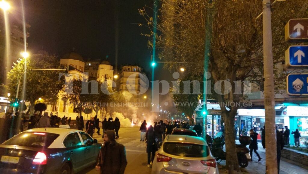 Μόλις ξεκίνησε η πορεία, άτομα από την περιοχή της Ροτόντας και κουκουλοφόροι που ήταν στην ουρά της πορείας πέταξαν μολότοφ και πυροτεχνήματα στις αστυνομικές δυνάμεις.