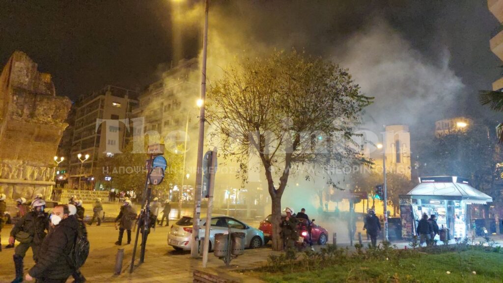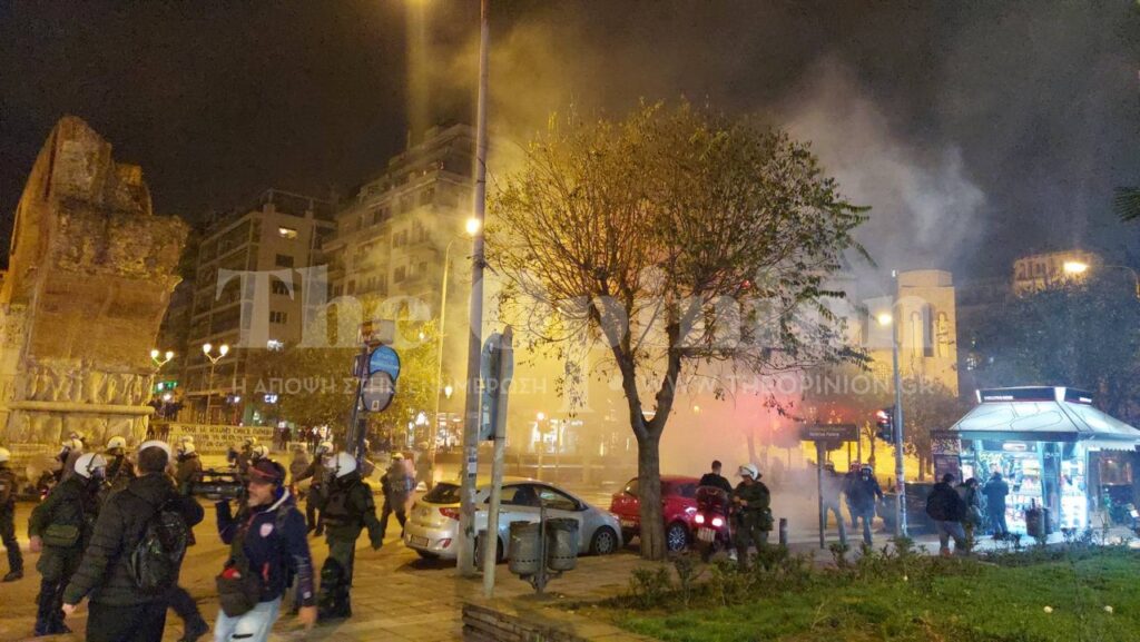Μόλις ξεκίνησε η πορεία, άτομα από την περιοχή της Ροτόντας και κουκουλοφόροι που ήταν στην ουρά της πορείας πέταξαν μολότοφ και πυροτεχνήματα στις αστυνομικές δυνάμεις.