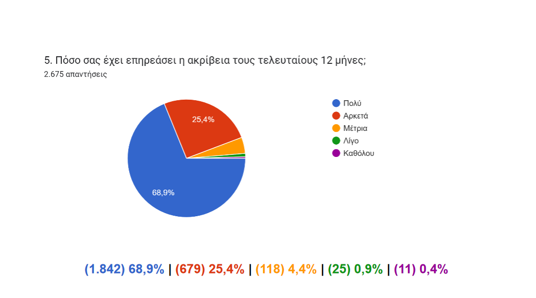 Τέλος, το 68,9% δηλώνει ότι έχει επηρεαστεί πολύ από την ακρίβεια τους τελευταίους δώδεκα μήνες,