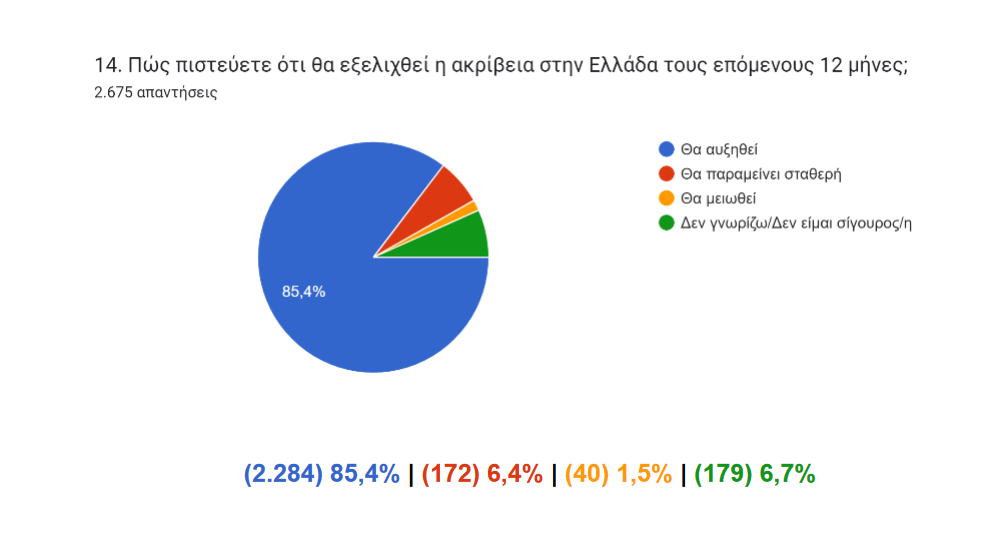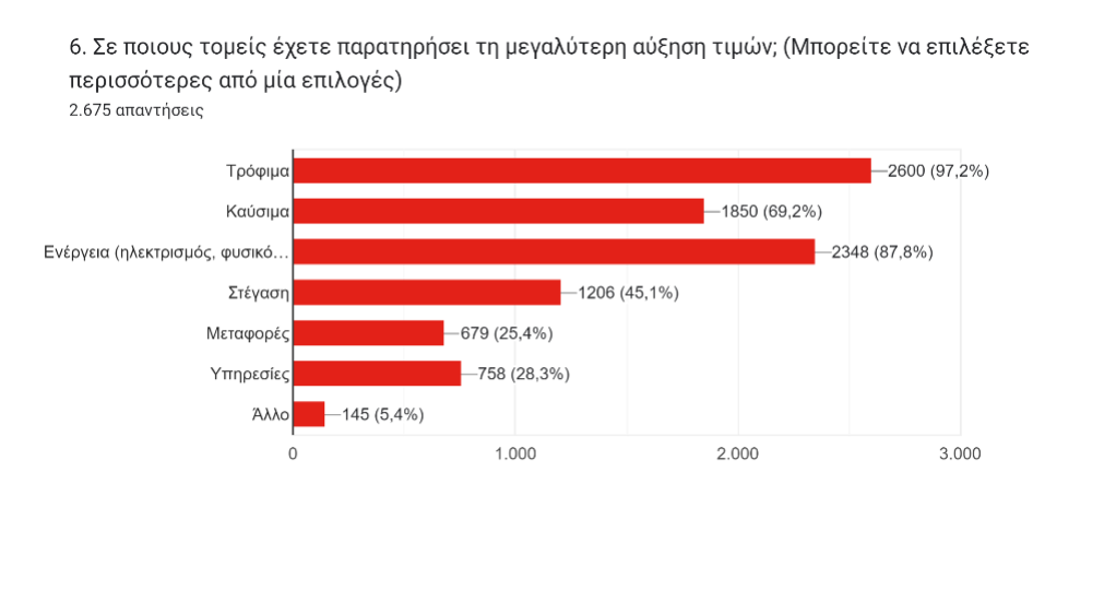 Σύμφωνα με την έρευνα, το 97,2% δηλώνει ότι υπήρξε μεγάλη αύξηση στα τρόφιμα. Ακολουθεί η ενέργεια, μετά τα καύσιμα, η στέγαση, ενώ ακολουθούν οι μεταφορές και υπηρεσίες.