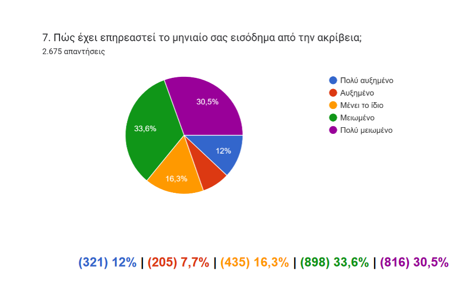 Το 33,6% δηλώνει ότι έχει μειωθεί το μηνιαίο εισόδημα του, ενώ το 30,5% έχει μειωθεί πολύ και το 16,3% δηλώνει ότι έχει μείνει ίδιο.