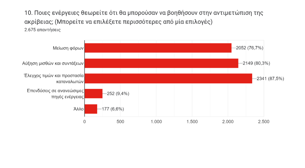 Το 87,5% ζητά ως μέτρο αντιμετώπισης της ακρίβειας τον έλεγχο των τιμών και την προστασία των καταναλωτών. Το 80,3% ζητά αύξηση μισθών και συντάξεων, ενώ το 76,7% θεωρεί ότι πρέπει να μειωθούν οι φόροι. Το 9,4% ζητά επενδύσεις σε ανανεώσιμες πηγές ενέργειας.