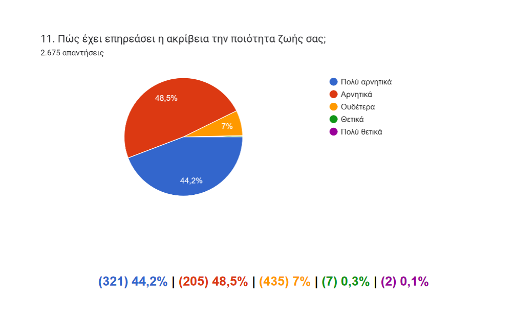Η ακρίβεια έχει επηρεάσει αρνητικά την ποιότητα ζωής των καταναλωτών σε ποσοστό 48,5% , πολύ αρνητικά 44,2% και 7% των ερωτηθέντων απαντά ουδέτερα.