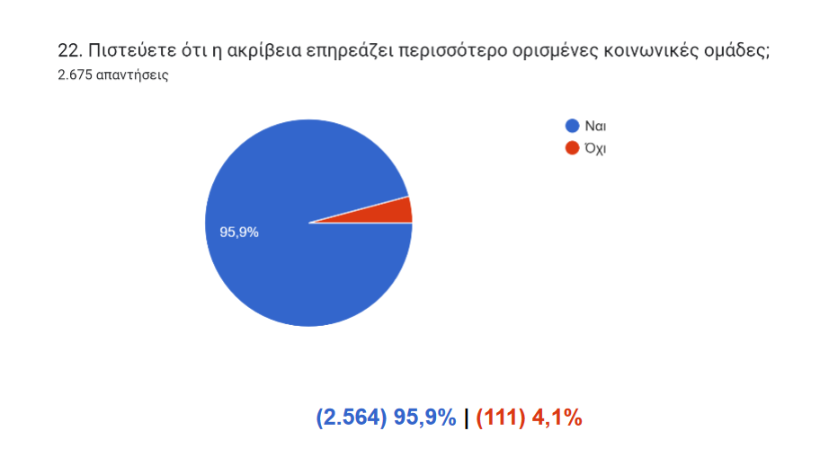 Παράλληλα, το 95,9% δηλώνει ότι η ακρίβεια ΄έχει επηρεάσει ορισμένες κοινωνικές ομάδες.