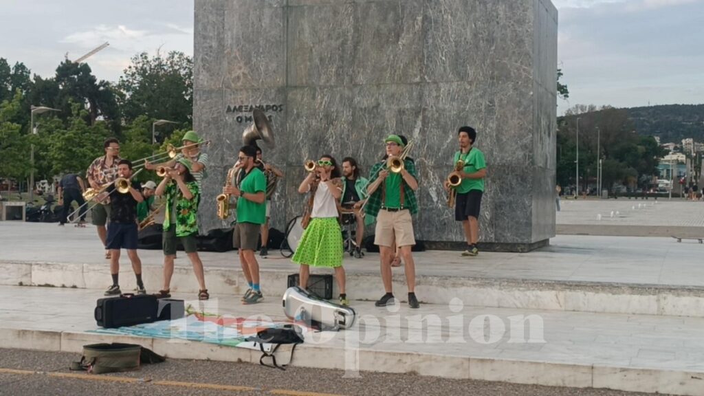 Το θέαμα αρκετά διασκεδαστικό, το τέμπο ανεβασμένο και τα μέλη της μπάντας σε τρελά κέφια έγιναν ένα με τους περιπατητές και τους τουρίστες στη Νέα Παραλία.