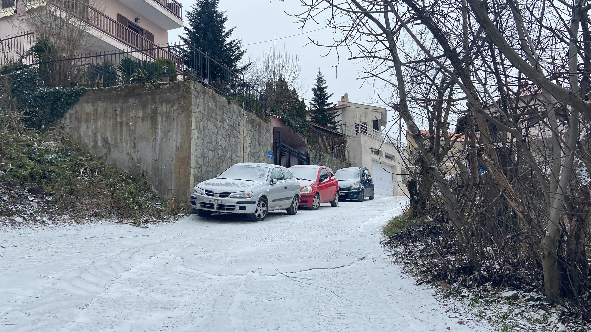 Οι κάτοικοι του Χορτιάτη μαθημένοι στα… χιόνια απολαμβάνουν το σκηνικό με τις στέγες που φιλοδοξούν να ασπρίσουν.