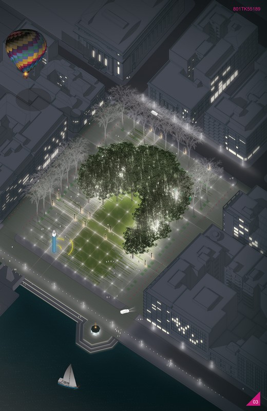«Το πράσινο στην πρόταση μας γίνεται κεντρικό στοιχείο της σύνθεσης και σύγχρονο διακριτικό της πλατείας», επισημαίνει ο κ. Χατζηγιαννόπουλος και προσθέτει: «προστατεύει αποτελεσματικά τους επισκέπτες από τον ήλιο κατά τη διάρκεια της ημέρας και τη νύχτα μετατρέπεται με τον έντονο φωτισμό σε έναν ασφαλή αστικό δημόσιο χώρο. Με την κατάλληλη γεωμετρία, η κεντρική συστάδα των δέντρων, διασφαλίζει τη συνεχή οπτική παρουσία της καθ’ όλη τη διάρκεια του έτους και ταυτόχρονα ρυθμίζει την επιθυμητή, ανάλογα με την κάθε εποχή του χρόνου, διείσδυση της ηλιακής ακτινοβολίας στον προστατευμένο χώρο που δημιουργεί. Το καλοκαίρι η συστάδα υποδέχεται την ευχάριστη μπουκαδούρα του Θερμαϊκού ενώ τον χειμώνα προστατεύει τους επισκέπτες της από τον βαρδάρη με το χαμήλωμα της βλάστησης στο βορειοδυτικό ανάπτυγμα της. Παράλληλα το πράσινο υπάρχει στην πρότασή μας με διαφορετική ένταση και στο “δάπεδο” της πλατείας».