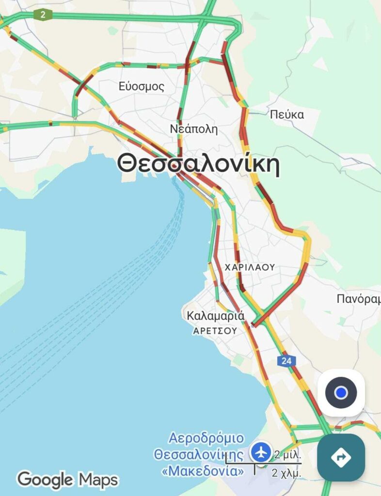 Πιο συγκεκριμένα, κίνηση συναντάται σε μεγάλο μέρος του Περιφερειακού και στις δύο κατευθύνσεις, με το σκηνικό να είναι παρόμοιο και στους κεντρικούς δρόμους της πόλης. Όπως μπορείτε να δείτε και στην παρακάτω φωτογραφία, στα «κόκκινα» είναι η οδός Εγνατία.