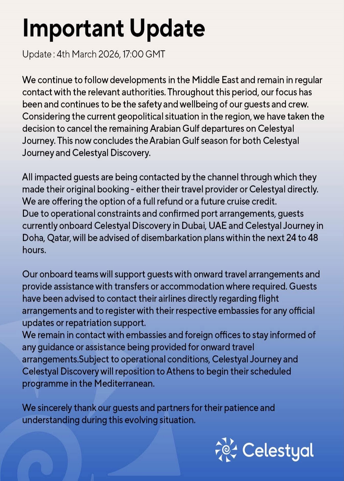 Οι κρουαζιέρες της Celestyal στον Αραβικό κόλπο θα ολοκληρώνονταν εντός του Μαρτίου, ωστόσο, λόγω της τρέχουσας γεωπολιτικήςς κατάστασης στην περιοχή, η εταιρία προχώρησε σε ακύρωση των υπολοίπων προγραμματισμένων αναχωρήσεων.