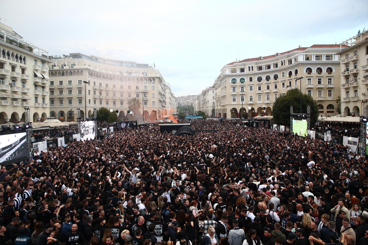Πλέον, στην Αριστοτέλους βρίσκονται χιλιάδες φίλοι του «Δικεφάλου» προκειμένου να γιορτάσουν τα 100 χρόνια ιστορίας του συλλόγου.