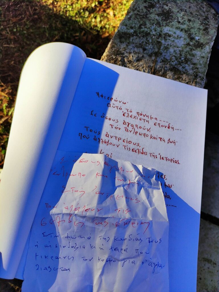 Τα λόγια τα είχε γραμμένα σε χαρτί που μου χάρισε. Πήγε μέχρι το αμάξι να μου φέρει και το βιβλίο του να μου χαρίσει. «Να μην απογοητεύονται οι νέοι. Θα αλλάξει ο κόσμος. Ο κόσμος είσαι εσύ. Να είσαι πεισματικά στον αγώνα».
