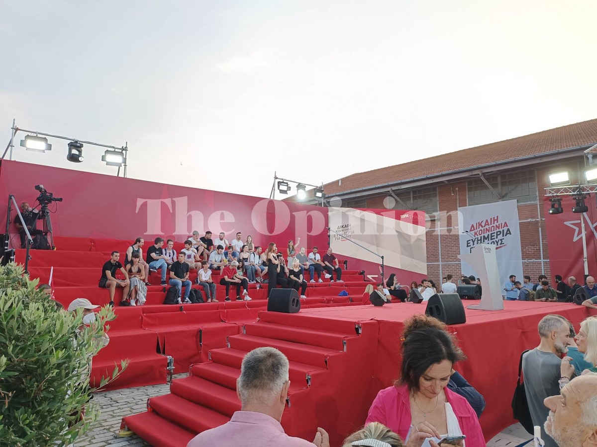 Η κεντρική εξέδρα στήθηκε στο τέλος της πρώτης προβλήτας του ΟΛΘ με πλάτη προς τη θάλασσα. Στο φόντο υπάρχει εξέδρα όπου βρίσκονται νεολαίοι του ΣΥΡΙΖΑ ενώ στα έδρανα θα δούμε και τους υποψηφίους βουλευτές του κόμματος στη Θεσσαλονίκη.