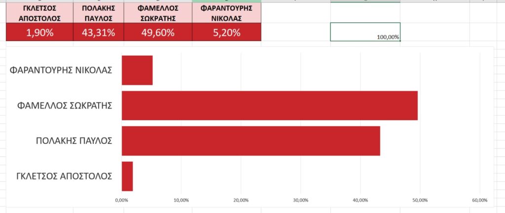 Στο 42% της ενσωμάτωσης τα αποτελέσματα έχουν ως εξής: Σ. Φάμελλος 49,76%, Παύλος Πολάκης 42,67%, Ν. Φαραντούρης 5,51% και Απ. Γκλέτσος 2,05%.