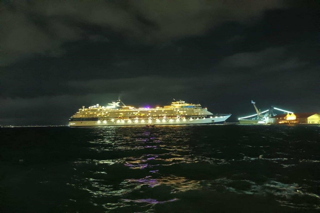 Πρόκειται για το πολυτελές Celebrity Infinity της εταιρίας κρουαζιέρας Celebrity Cruises, μέλους του κορυφαίου ομίλου κρουαζιέρας Royal Carribean Group, το οποίο σύμφωνα με πληροφορίες του TheOpinion.gr ταξιδεύει με 2.178 επιβάτες εκ των οποίων η πλειοψηφία είναι Αμερικανοί (1.238), Καναδοί (385), Βρετανοί (209) και λοιπές εθνικότητες.