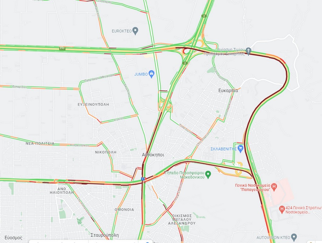 Εσωτερική Περιφερειακή, Εξωτερική Περιφερειακή, οι κεντρικοί οδικοί άξονες, όλα μποτιλιαρισμένα.