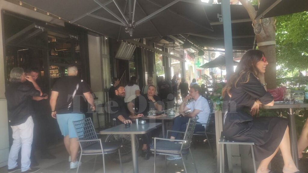 Οι τρεις άνδρες συζητούν σε πολύ χαλαρή διάθεση, ενώ η παρέα τους έχει μαγνητίσει τα βλέμματα των θαμώνων και των περαστικών. Δεν είναι λίγοι αυτοί που τους πλησιάζουν και τους δίνουν χειραψίες.