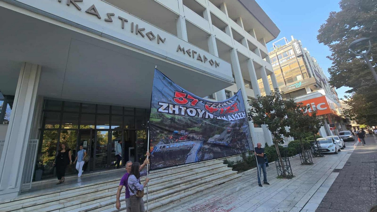 Ένα πανό με το σύνθημα “Δεν ξεχνώ, 57 ψυχές ζητούν δικαίωση” κρατούν μπροστά στα σκαλοπάτια του δικαστικού μεγάρου Λάρισας συγγενείς θυμάτων της τραγωδίας των Τεμπών.