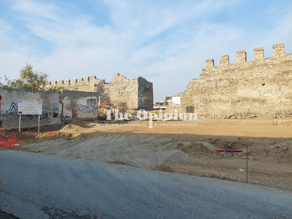 Η οδός Επταπυργίου είναι δρόμος δύο κατευθύνσεων (!) που μέχρι και πριν λίγα χρόνια περνούσε και λεωφορείο του ΟΑΣΘ. Από την μια μεριά, υπάρχει στενό πεζοδρόμιο κι από την άλλη πλευρά μεγαλύτερο πεζοδρόμιο με πασαλάκια ανά κάποια μέτρα, τα οποία τοποθετήθηκαν στο πλαίσιο της ανάπτυξης της συγκεκριμένης αλάνας. Το ένα μέρος της ανάπλασης φαίνεται να έχει ολοκληρωθεί, με ελιές, γκαζόν και παγκάκια να δημιουργούν μια πιο «πράσινη» εικόνα κάτω από το τείχος.