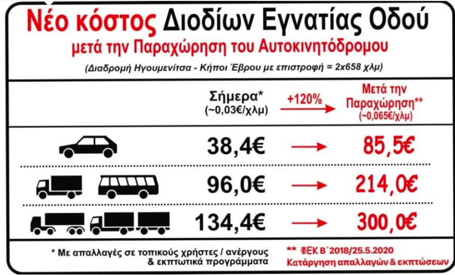 Μετά την κοινή υπουργική απόφαση που υπογράφηκε την Τετάρτη, το τίμημα των διοδίων από 0,03 ευρώ ανά χιλιόμετρο σήμερα, θα αυξηθεί στα 0,04 για να φτάσει μέσα στα επόμενα τρία χρόνια τα 0,065 ενώ θα καταργηθούν άμεσα οι δωρεάν μετακινήσεις για τις τοπικές κοινωνίες και τους άνεργους που χρησιμοποιούν την Εγνατία, όπως τονίζουν χαρακτηριστικά οι εργαζόμενοι της Εγνατίας Οδού Α.Ε.