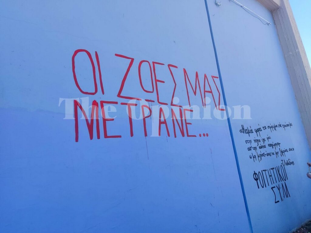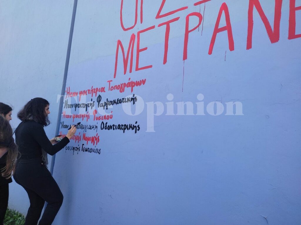 Οι φοιτητές έγραψαν στον τοίχο του ΑΠΘ το σύνθημα “Οι ζωές μας μετράνε”, κι από κάτω τις ιδιότητες των νεκρών φοιτητών.