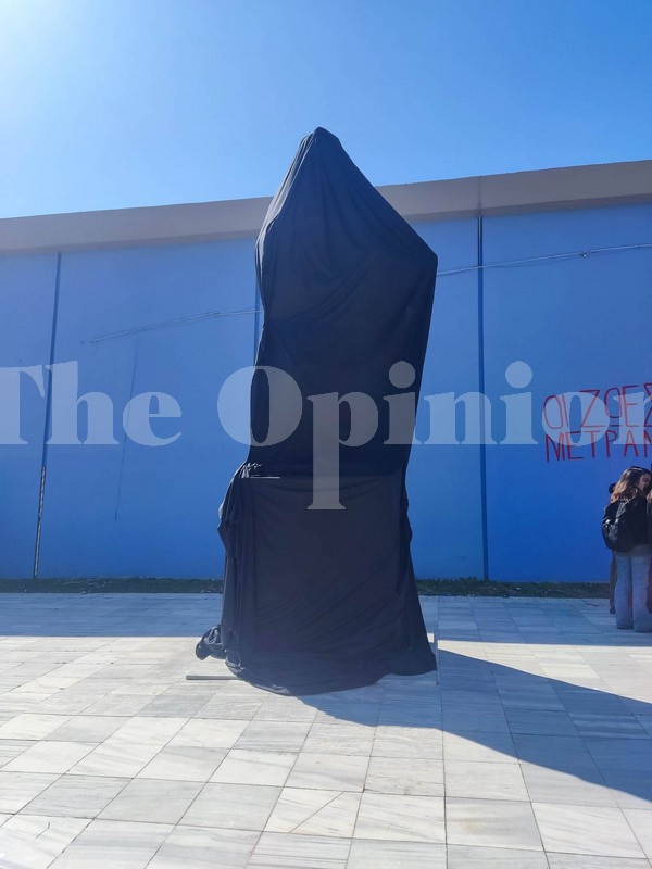 Οι φοιτητές έντυσαν με μαύρο πανί το άγαλμα του Αριστοτέλη και άφησαν σε αυτό λευκά γαρύφαλλα, τιμώντας τους νεκρούς φοιτητές.