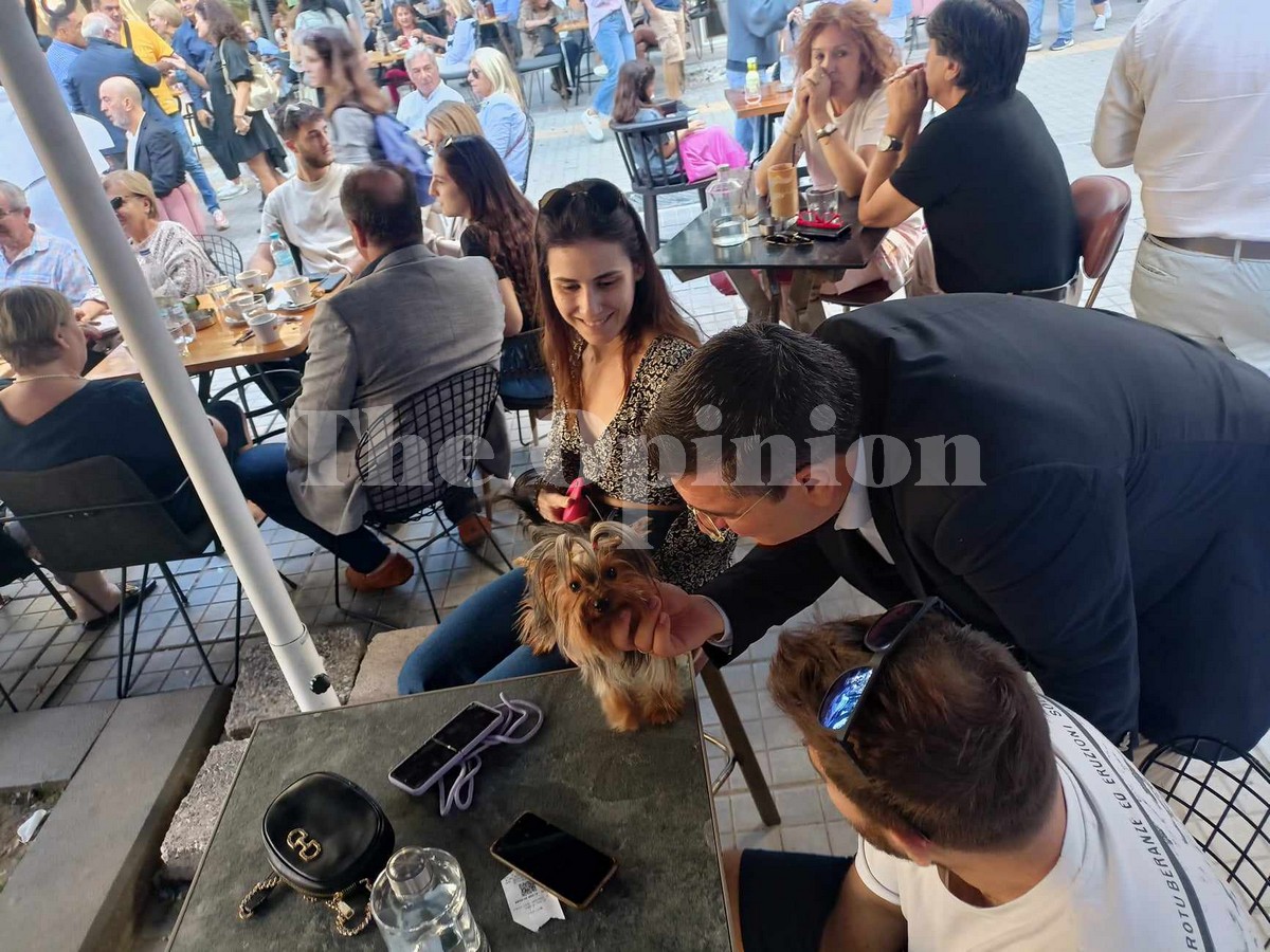 Συνοδευόμενος από τους στενούς του συνεργάτες, περπάτησε στον πεζόδρομο, όπου συνομίλησε σε θερμό κλίμα με πολλούς θαμώνες, οι οποίοι βρίσκονταν στις καφετέριες, ενώ δε δίστασε να βγάλει και τις καθιερωμένες selfie και φωτογραφίες.