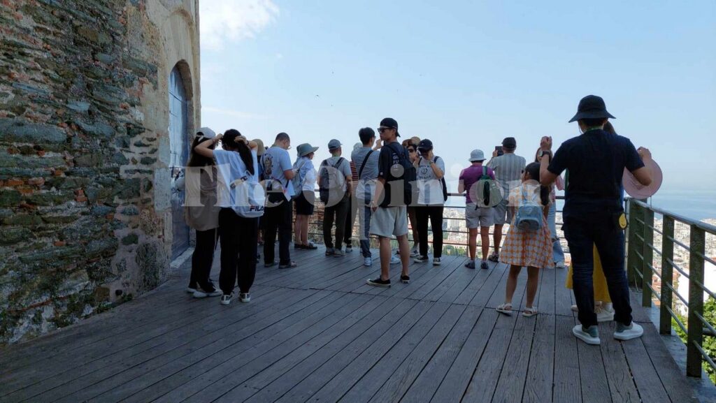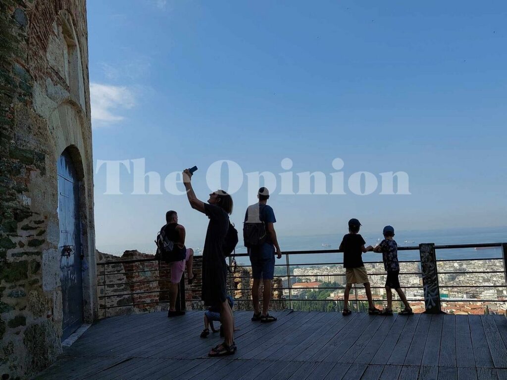 “One, Two, say Greece” λένε οι τουρίστες, ενώ φωτογραφίζονται με θέα όλη τη Θεσσαλονίκη από την Πύργο του Τριγωνίου στην Άνω Πόλη.