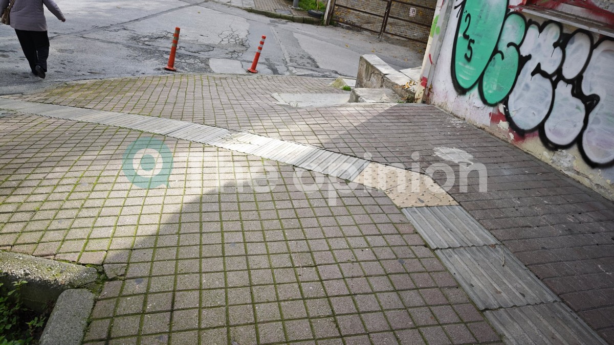 Κάνοντας μια βόλτα στο μήκος της Ολυμπιάδος, η εικόνα είναι απογοητευτική, σπασμένες πλάκες, κενά που καλύπτονται πρόχειρα, σημεία όπου η διάβαση είναι προσπέλαστη. Οι οδηγοί όδευσης τυφλών βρίσκονται σε κακή κατάσταση, με σημεία όπου είτε καταλήγουν απευθείας στον δρόμο είτε σταματούν πάνω σε σίδερα, όπως αποτυπώνεται και στις φωτογραφίες του TheOpinion.