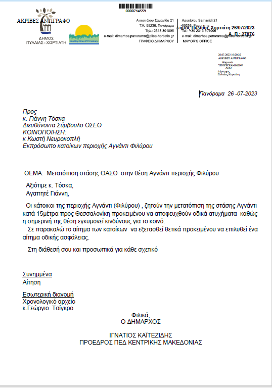 Οι κάτοικοι της περιοχής έχουν κάνει εδώ και καιρό αίτημα στον ΟΣΕΘ για την μετακίνηση της στάσης του λεωφορείου της γραμμής 64 «Ν .Σ .Σταθμός- Τ .Σ .Φιλύρου» λίγα μέτρα πιο μακριά. Ο δήμαρχος Πυλαίας – Χορτιάτη Ιγνάτιος Καϊτεζίδης, βρίσκεται στο πλευρό των κατοίκων από την πρώτη κιόλας στιγμή, όχι μόνο μεταφέροντας το αίτημα των πολιτών στον ΟΣΕΘ με δική του επιστολή, αλλά και παρευρισκόμενος αρκετές φορές στο σημείο, ώστε να έχει πλήρη εικόνα για την κατάσταση.