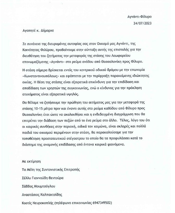 Εκτός από την μετακίνηση της στάσης λεωφορείου, οι κάτοικοι έχουν προχωρήσει και σε ένα άλλο αίτημα, σχετικά με την δημιουργία διάβασης στο σημείο. Όπως αναφέρει ο κ. Νευροκοπλής, οι κάτοικοι της τοπικής κοινότητας περνούν καθημερινά τον δρόμο προκειμένου να πάρουν κάποιο λεωφορείο και να μετακινηθούν είτε προς το Φίλυρο, είτε προς τη Θεσσαλονίκη.