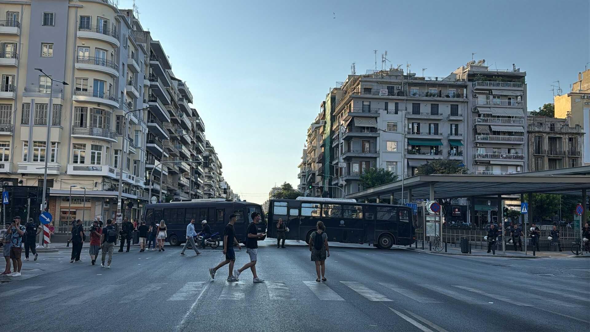 Φραγμός της ΕΛΑΣ στο ύψος του σταθμού Αγίας Σοφίας του Μετρό Θεσσαλονίκης ώστε η πορεία των αντιεξουσιαστών να μην συμπέσει με την συγκέντρωση της ΓΣΕΕ στο Άγαλμα Βενιζέλου.