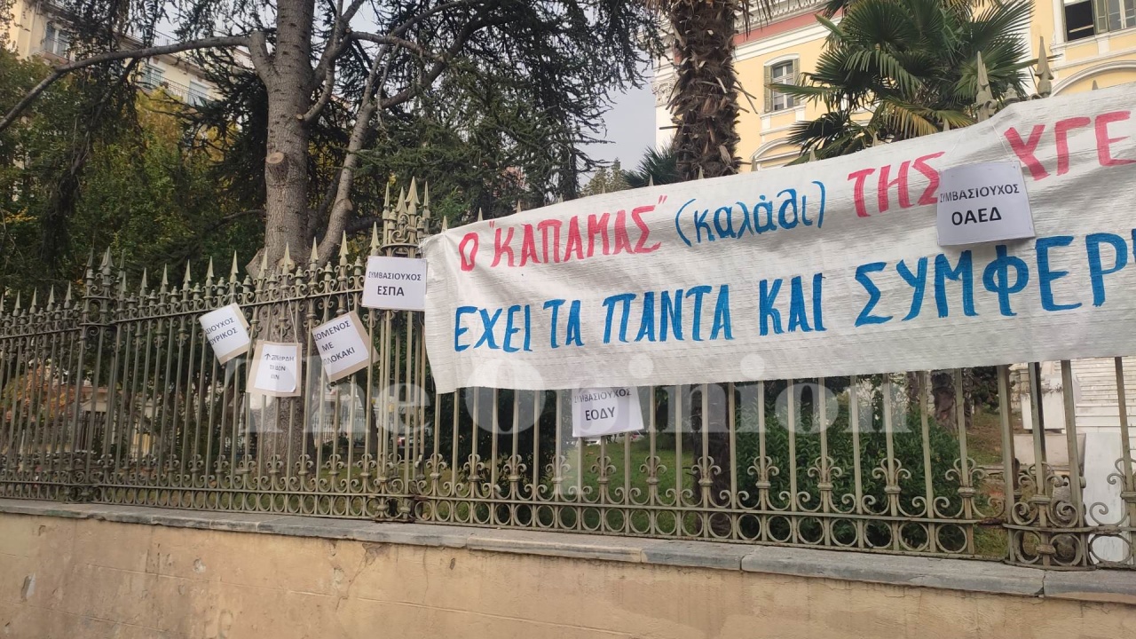 Υγειονομικοί σε αναστολή, φωνάζουν συνθήματα μπροστά από την είσοδο του υπουργείου, ζητώντας την παραίτηση του πρωθυπουργού, Κυριάκου Μητσοτάκη.
