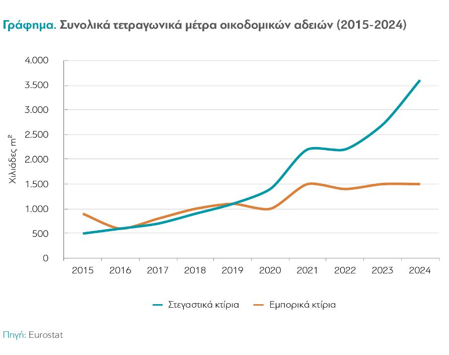 Από την άλλη πλευρά, η προσφορά κατοικιών δεν φαίνεται να ικανοποιεί τη ζήτηση. Τα στοιχεία δείχνουν μεν ότι η οικοδομική δραστηριότητα ανέκαμψε Από το 2019 και μετά, οι οικοδομικές άδειες για κατοικίες είναι σταθερά συγκριτικά περισσότερες από ό,τι στο παρελθόν, περίπου 70% του συνόλου (2024).