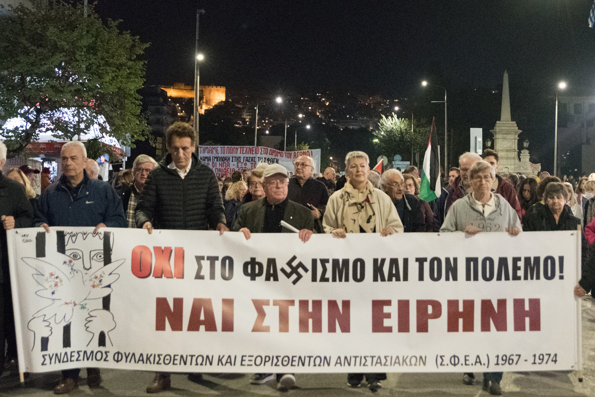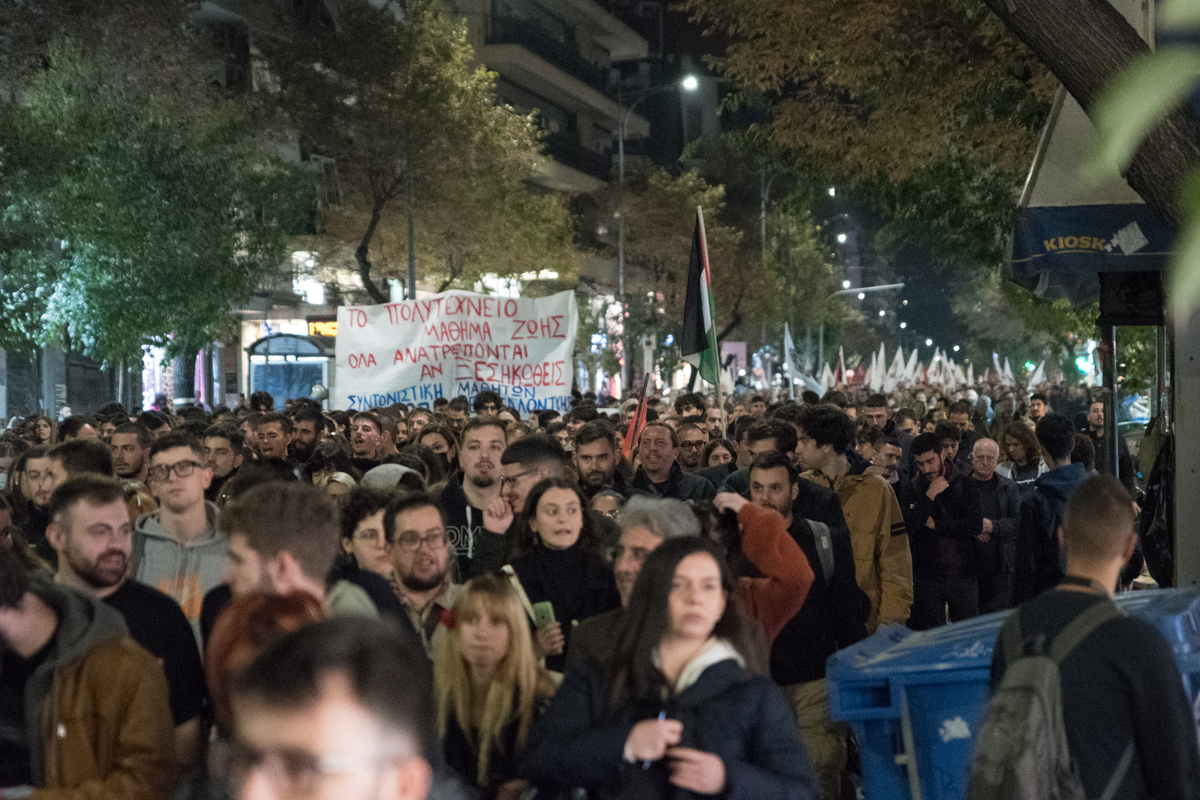Σχεδόν 10.000 κόσμος κάθε ηλικίας συγκεντρώθηκε στην Θεσσαλονίκη τιμώντας τους νεκρούς που θυσιάστηκαν για τη δημοκρατία και δηλώνοντας απερίφραστα τη συμπαράστασή του στον παλαιστινιακό λαό. «Ψωμί – Παιδεία – Ελευθερία, εμπρός για της γενιάς μας τα Πολυτεχνεία» φώναζαν τέσσερα μικρά παιδιά κάτω από 10- 11 χρόνων κρατώντας πανό, χαρίζοντας ελπίδα.