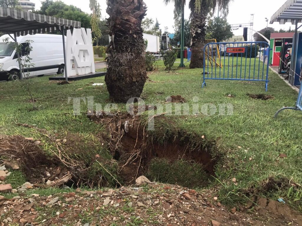 Συνεργεία εργάζονται πυρετωδώς για να αποκαταστήσουν τις ζημιές που προκλήθηκαν και σε αλλά υπόστεγα που ήταν στημένα από την εξωτερική πλευρά του περίπτερου.