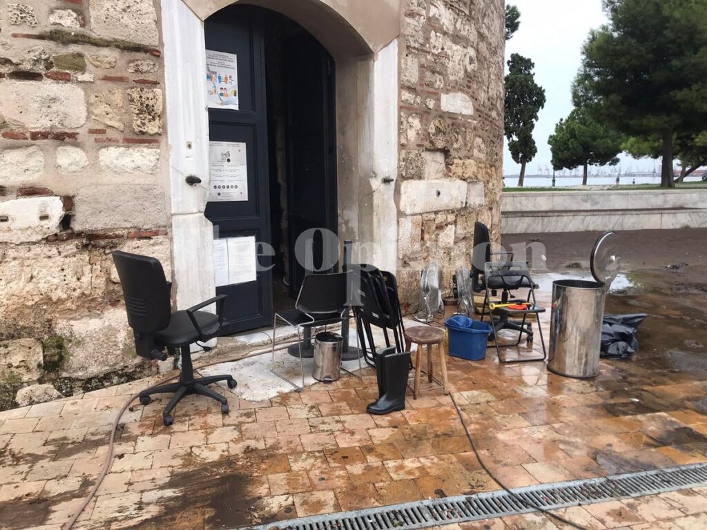 Το τοπόσημο της Θεσσαλονίκης αυτή την ώρα παραμένει κλειστό καθώς συνεργεία καθαρίζουν τις λάσπες και ξεβουλώνουν τα φρεάτια στο εσωτερικό.