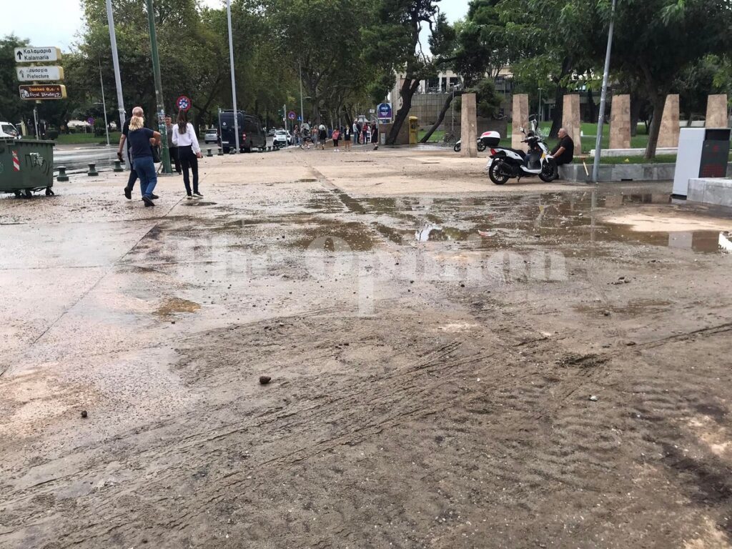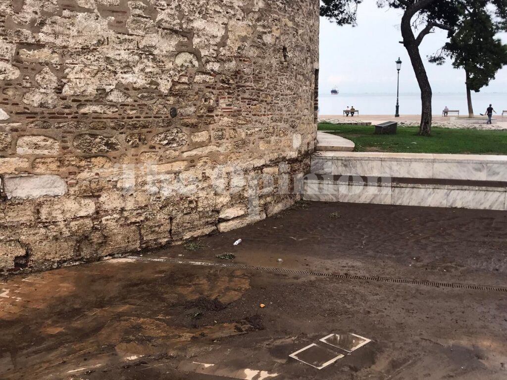 Ούτε ο Λευκος Πυργος κατάφερε να βγει αλώβητος από την σφοδρή βροχόπτωση που έπληξε την Θεσσαλονίκη τα ξημερώματα της Δευτέρας, δημιουργώντας πλήθος προβλημάτων σε όλη την πόλη.
