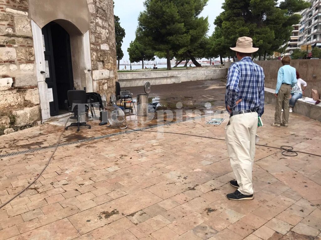 Τουρίστες παρακολουθούν με απορία τους υπαλλήλους να καθαρίζουν λάσπες στο πιο γνωστό μνημείο της Θεσσαλονίκης.