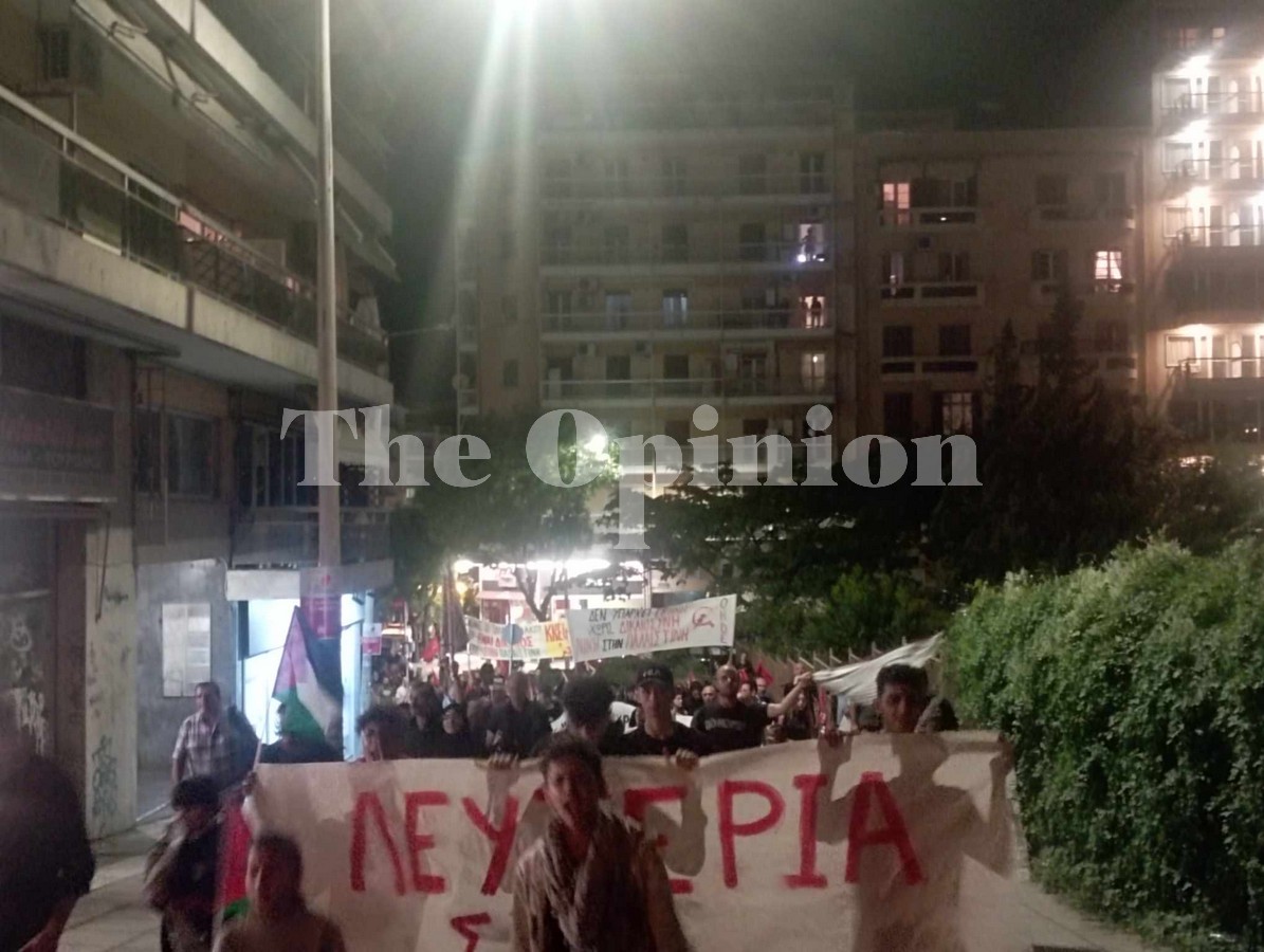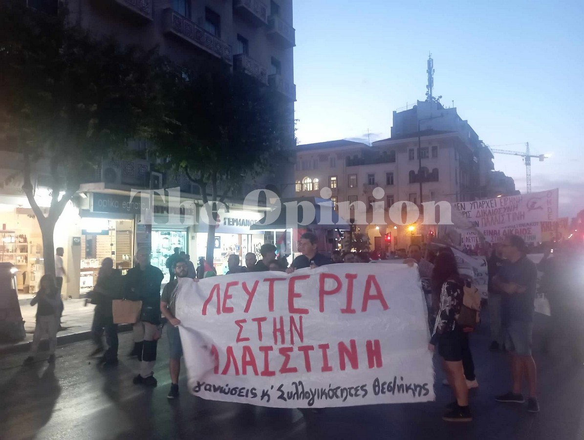 Πορεία συμπαράστασης στην Παλαιστίνη και στο λαό της βρίσκεται σε εξέλιξη, το απόγευμα της Τρίτης, σε κεντρικούς δρόμους της Θεσσαλονίκης, με τους συμμετέχοντες να κρατούν πανό και να φωνάζουν συνθήματα.