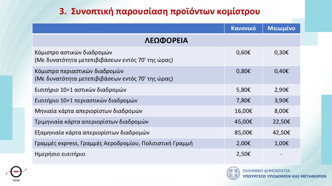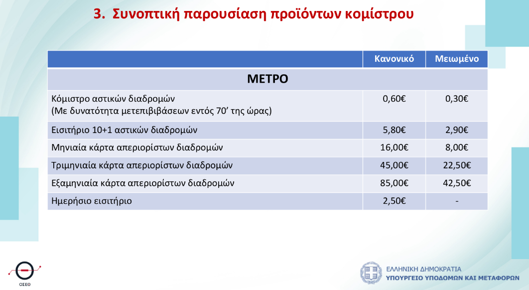 1. Μειώνεται το κόστος μετακίνησης με τα Μέσα Μαζικών Μεταφορών εφόσον ο χρήστης χρησιμοποιεί μόνο λεωφορείο ή μόνο Μετρό (δηλαδή 0,60€ ή 0,80€ αντί του 0,90 ή 1,10€ ή 1,30€ που ισχύει σήμερα στα λεωφορεία)