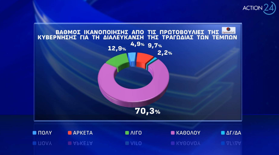 Ταυτόχρονα υπάρχει μια συντριπτική πλειοψηφία που δεν είναι ικανοποιημένος από τις πρωτοβουλίες της Κυβέρνησης για την πλήρη διαλεύκανση των ευθυνών για τα Τέμπη. Πολύ και αρκετά ικανοποιημένοι είναι το 14.6%, ενώ το 12.9% είναι λίγο ικανοποιημένοι και το 70.3% καθόλου ( αθροιστικά 83.2%).