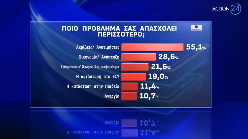 Η ακρίβεια συνεχίζει να βρίσκεται μακράν πρώτο πρόβλημα στις προτεραιότητες των πολιτών με 55.1% και ακολουθούν η Οικονομία με 28.6%, η εγκληματικότητα/ παραβατικότητα με 21.6%, η κατάσταση στο ΕΣΥ με 19% , η κατάσταση στην Παιδεία με 11.4% και η ανεργία με 10.7%.